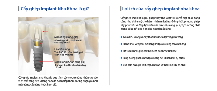 Cấy ghép Implant nha khoa là quy trình cấy một trụ răng nhân tạo vào vị trí mất răng trên xương hàm để hỗ trợ lắp thêm các bộ phận giả như mão răng, cầu răng hoặc hàm giả.